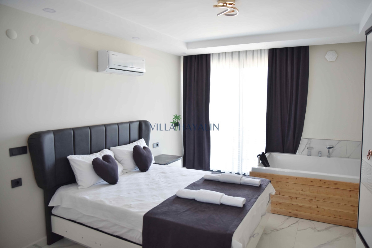 1.Yatak Odası(Aile): 1 adet çift kişilik yatak, klima, makyaj masası, komodin, elbise dolabı, jakuzi, Smart TV, banyo tuvalet bulunmaktadır.